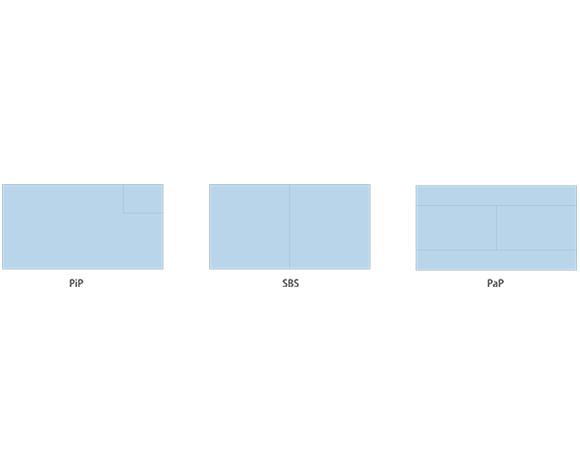 Two independent signal sources can be viewed side by side on the screen at the same time or display in PiP mode in any corner of the display. When using PaP, SBS or PiP, the size and position of both windows can be adjusted.