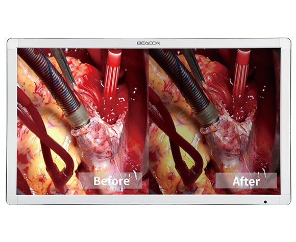 The innovative optical enhancement by vacuum bonding between the LCD panel and the protective screen, will amplify the image performance to eliminate the light reflection and enhance the contrast ratio as the primary purpose and improve the luminance & the color sharpness to suit dedicated surgical imaging.